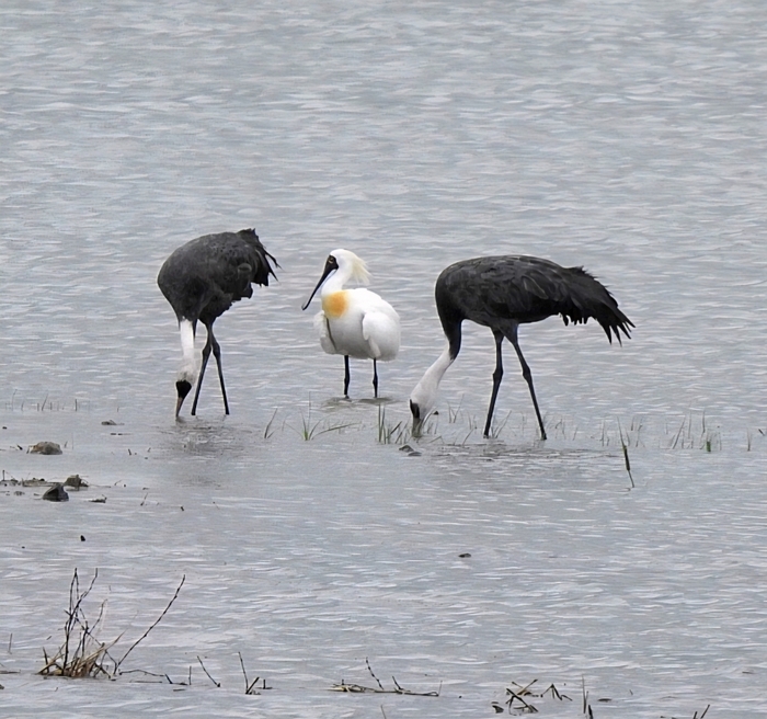 지난 20일 순천만 복원습지에서 겨울철새인 흑두루미 한 쌍과 여름철새인 저어새가 한 장면에 포착됐다.